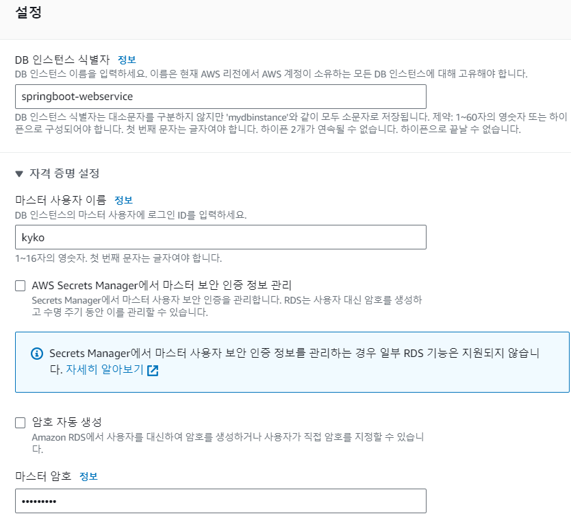 4. 인스턴스 이름과 마스터 사용자 정보 등록