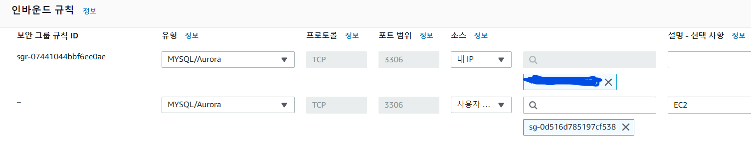 - 두 번째 줄: EC2의 보안 그룹을 추가