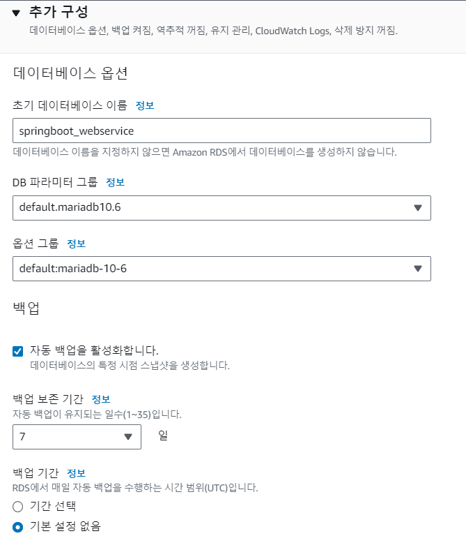 DB 파라미터 그룹은 위의 MariaDB 버전과 일치시켜야 합니다.