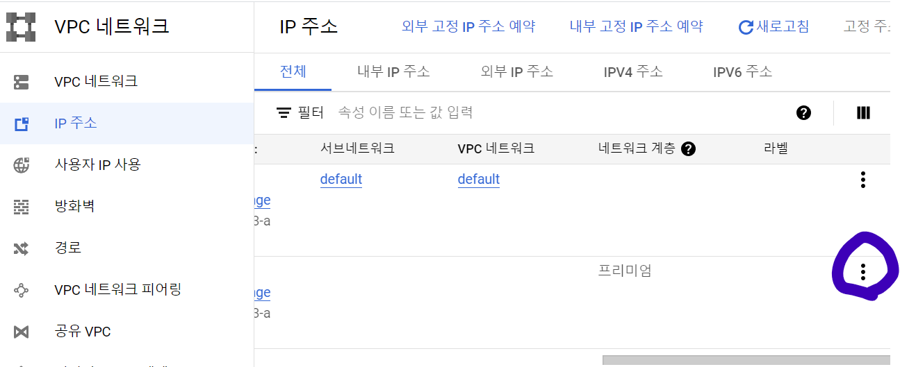 1) 화면 왼측 메뉴 -> VPC 네트워크 -> IP 주소 -> 메뉴(점 3개) 클릭