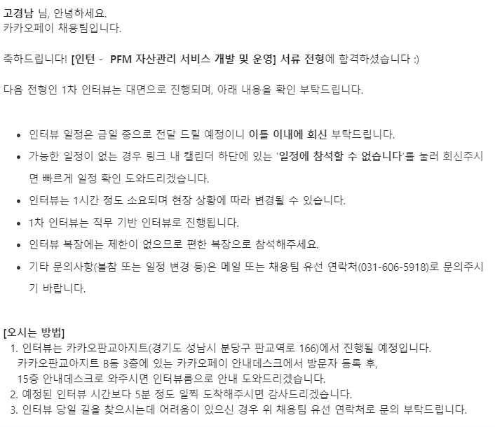 면접은 굉장히 편안한(?) 분위기에서 진행되었고, 카카오페이 직원분들께서 제가 진행하던 모여타(택시 합승 서비스) 프로젝트에 대해 칭찬도 해주셨습니다. 그리고 중간중간 퀴즈에 대해 대답하면 '정답입니다'라고 말씀해 주셔서 즐거웠습니다.ㅎㅎ