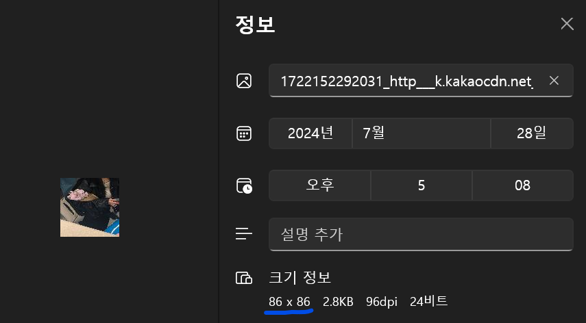이미지 URL에 접근하여 크기를 확인해보니 크기가 86 x 86으로 변경된 것을 확인할 수 있었습니다.