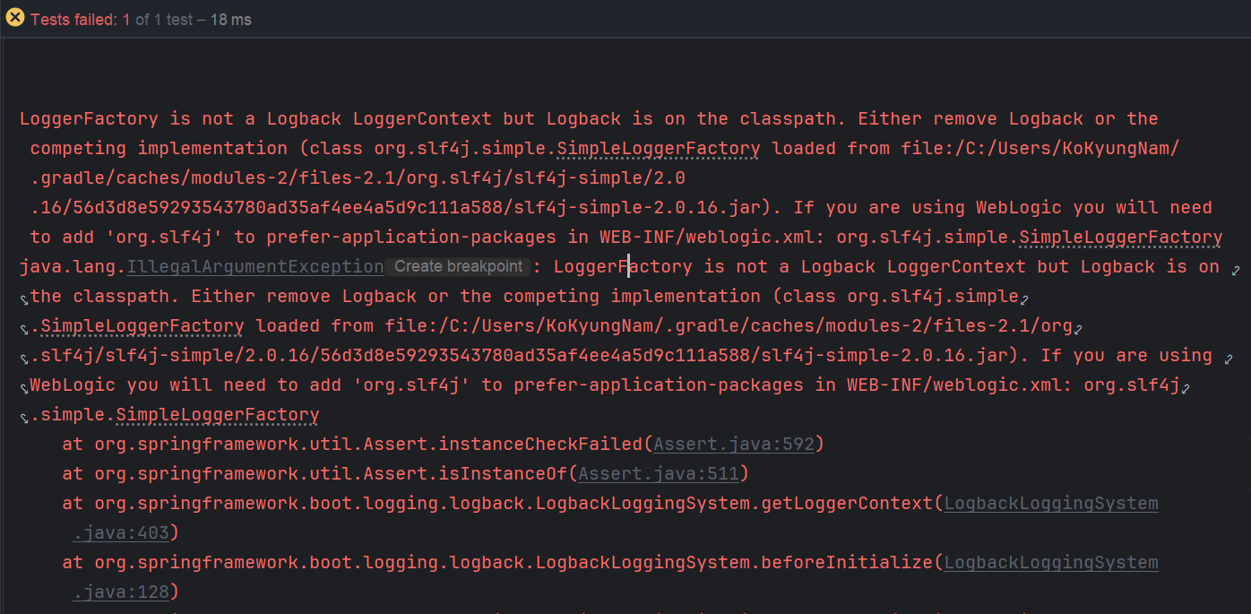 그렇기에 SpringBoot 내장 slf4j와 충돌해서 발생한 에러였습니다.