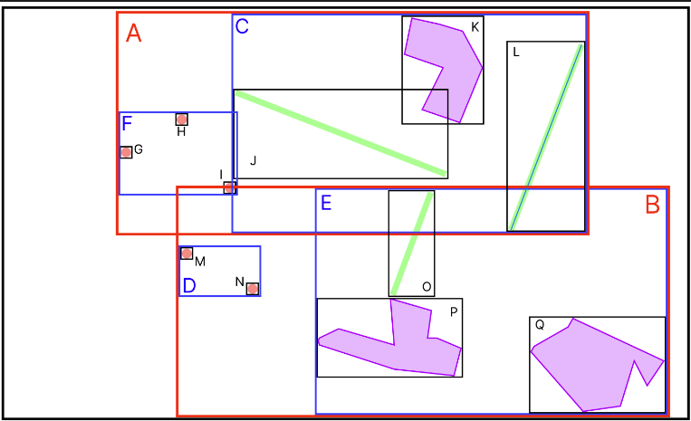위와 같이 지도에 위치한 Point(빨간 점), LineString(초록선), Polygon(보라색 다각형)이 있을 때, 각 공간 데이터의 MBR은 다음과 같습니다.