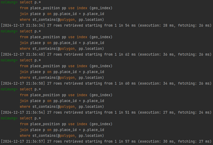 쿼리 실행 결과를 확인한 결과, geo_index가 잘 적용되어 있는 것을 확인할 수 있습니다.