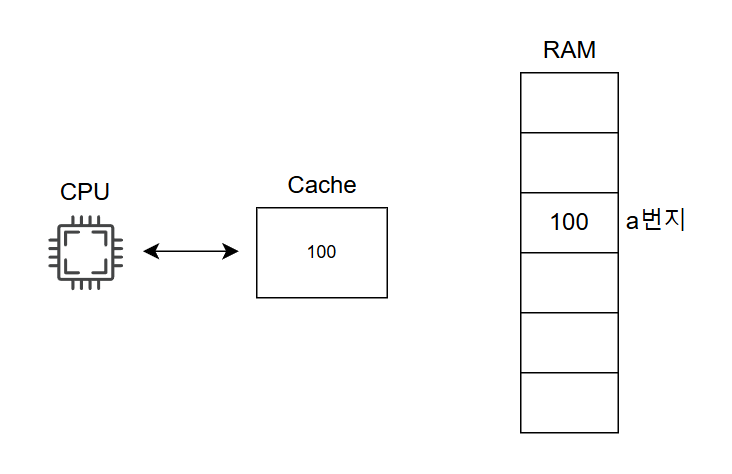 현재 메모리의 a번지에 100이라는 값이 저장되어 있고, 이 값을 캐시 메모리에도 저장되어 있다고 가정해 보겠습니다.