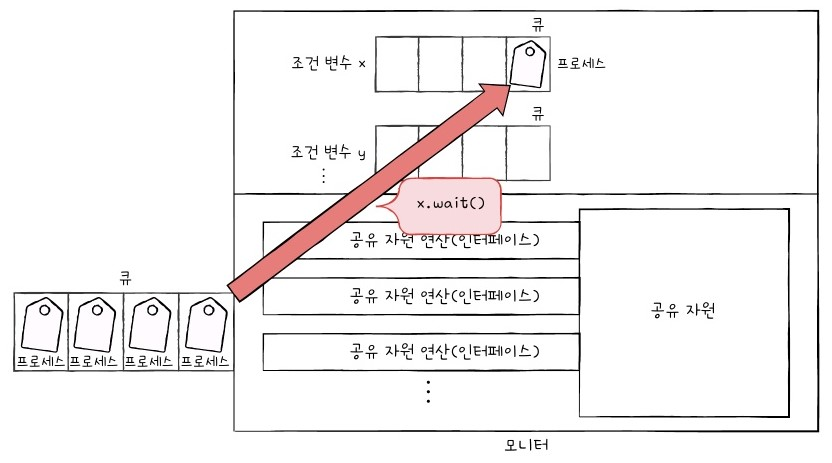 프로세스 및 스레드는 공유 자원에 접근하기 위해 반드시 모니터를 통해야 하며, 모니터 내부에서는 하나의 프로세스 및 스레드만 실행될 수 있습니다. 이미 모니터 내에서 실행 중인 프로세스 및 스레드가 있을 경우 큐에서 대기해야 합니다.