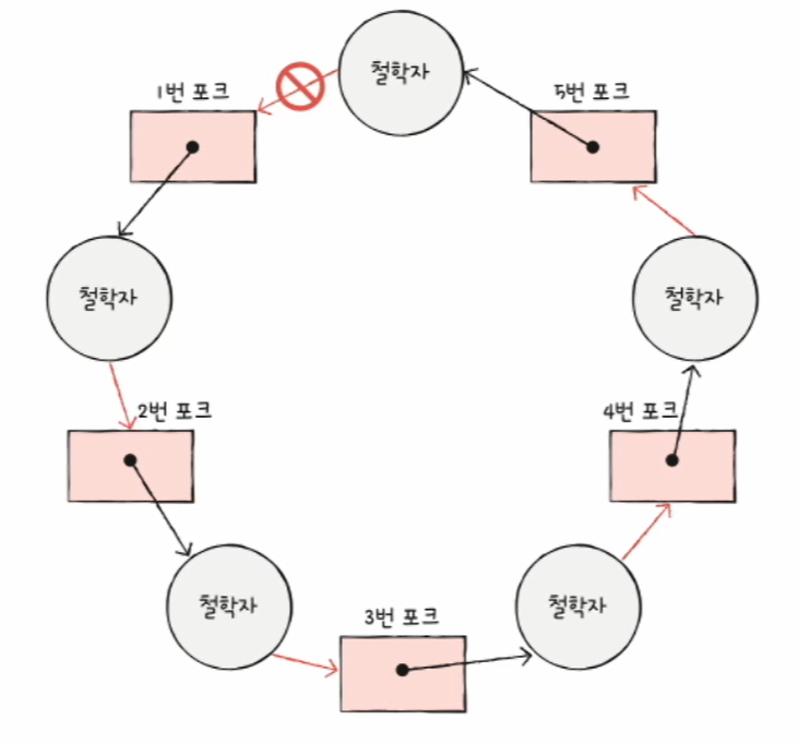 1번 포크 → 2번 포크 → 3번 포크 → 4번 포크 → 5번 포크에서 다시 1번 포크를 잡지 못한다.