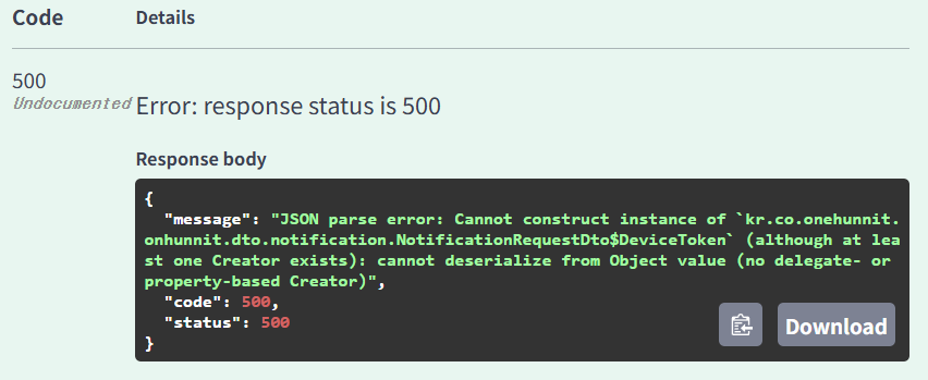 에러 메시지를 확인한 결과 JSON 데이터를 NotificationRequestDto.DeviceToken 객체로 역직렬화하는 과정에서 에러가 발생하고 있었습니다.