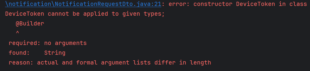 DeviceToken 클래스는 필드가 1개이기 때문에 기본 생성자를 생성하기 위해 @NoArgsConstructor를 추가했습니다.
